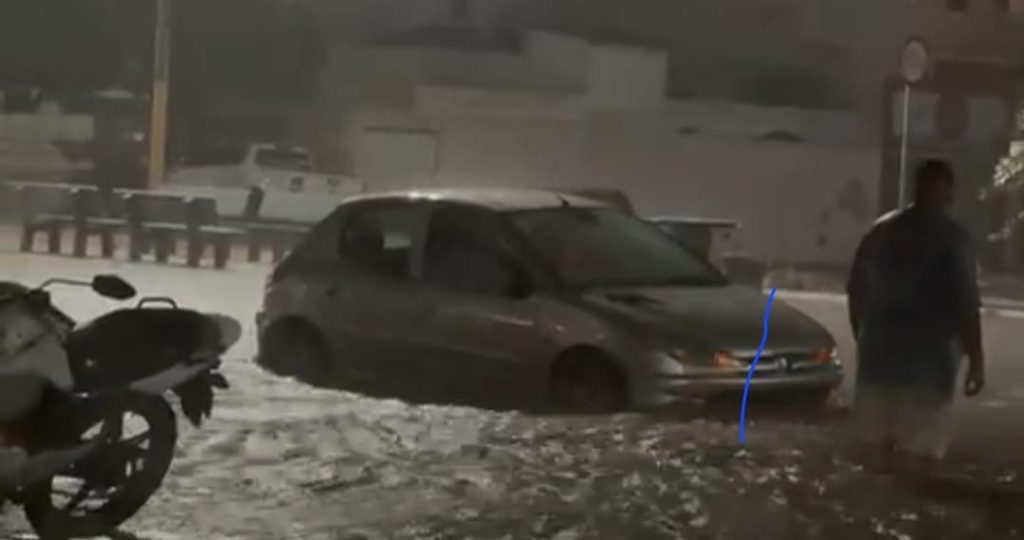 Na Avenida Ruy Barbosa, uma das principais vias de Itaberaba, um veículo ficou preso em meio à enxurrada. A ocupante precisou de ajuda para sair do carro em segurança, em uma cena que chamou a atenção de quem passava pelo local.