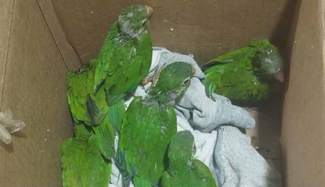 No local, os policiais flagraram a comercialização irregular de animais silvestres. Foram apreendidos dois pássaros da espécie bigodinho-pardo e seis filhotes de periquitos, que estavam em condições inadequadas e seriam vendidos.